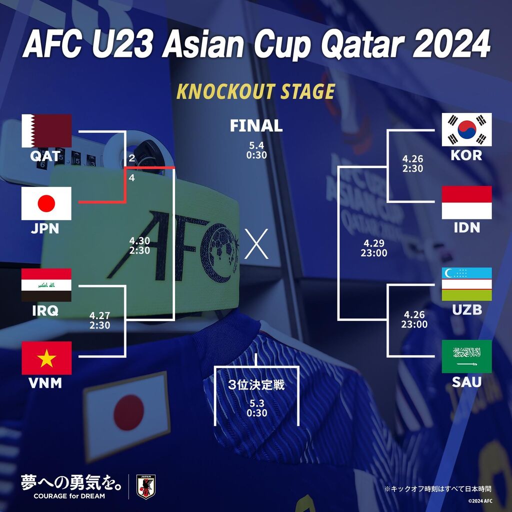 パリ五輪パリ五輪出場権を得るのは今大会の3位までで、4位はアフリカ大陸とのプレーオフに回る。U-23日本代表は日本時間4月30日の準決勝でイラク対ベトナムの勝者と戦う