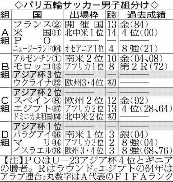 アジア・サッカー連盟(AFC)から通達があったという。日本協会によると、アジア枠の振り分け方法は今大会前にAFCから「U―23アジア杯の成績順」への変更通達を受けた。それによると「優勝」でD組、「準優勝」でスペイン、エジプト、ドミニカ共和国とのC組、「3位」でアルゼンチン、モロッコ、ウクライナとのB組に入る。