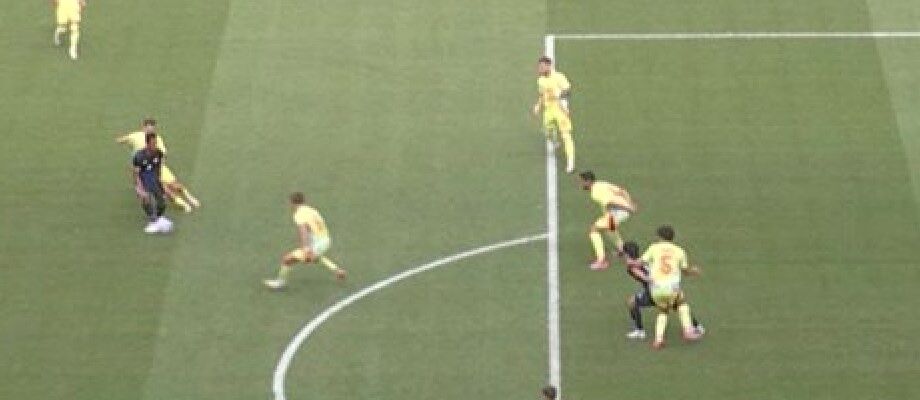 サッカー男子日本が同点ゴールが幻になった。前半40分、細谷真大がゴール前でパスを受けて反転。右足で同点弾を決めたかに見えたが、直後にVAR判定。取り消された。